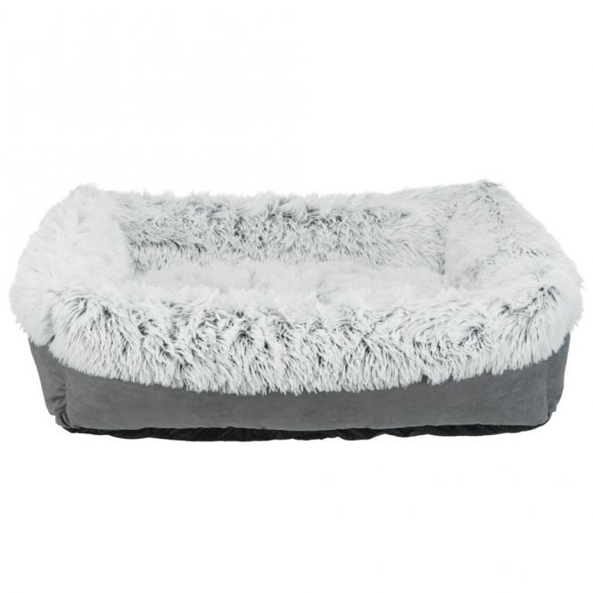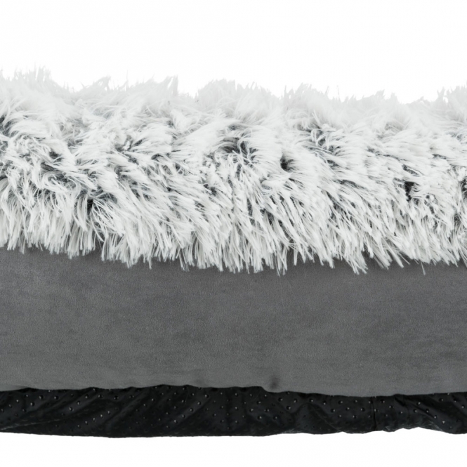 Dit rechthoekige hondenbed van Trixie is een zachte ligplaats met een vaste kussenrand en een pluche buitenkant. De hoes voelt veloursachtig aan met langharig pluche, en de vulling is van polyestervlies. Onderop zit een antisliplaag zodat het bed minder snel verschuift op een gladde vloer. De kleuren zijn rustig gehouden in grijs met wit en zwart, passend bij veel interieurs.