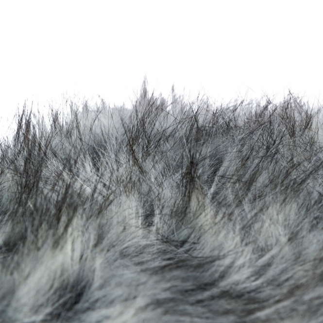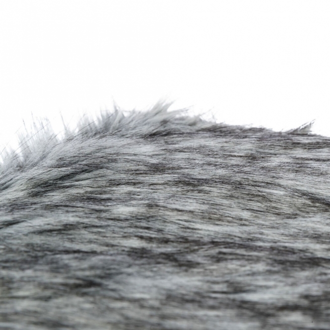 De buitenkant is gemaakt van polyester met een lange pluche pool, dat zacht aanvoelt en prettig is om op te liggen. De vulling bestaat uit polyestervlies, wat zorgt voor een zachte opvulling zonder harde plekken. De kleurencombinatie is zwart-grijs en de afwerking is eenvoudig en zonder decoratieve details.
