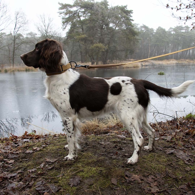 Dit halsband is extra breed en heeft een zachte neopreenlaag voor comfort rond de hals. De kleur is honinggoud en het ontwerp is bedoeld voor dagelijks gebruik.