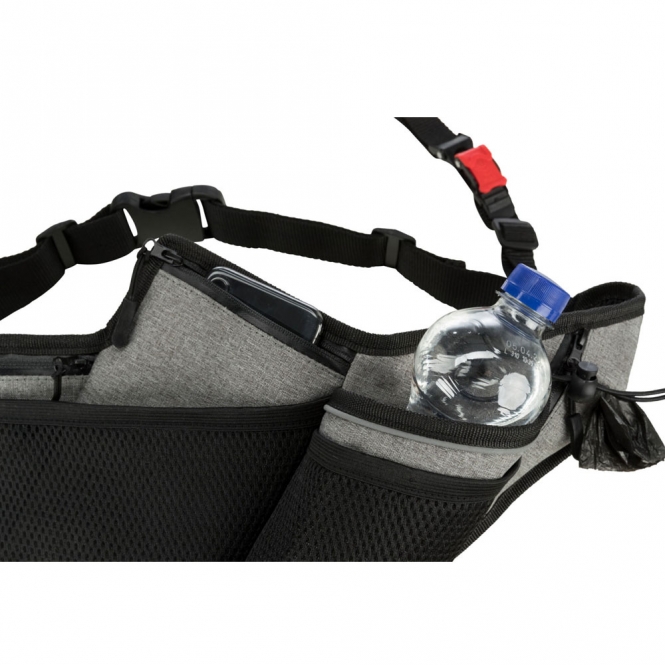 Er zijn meerdere vakken aangebracht zodat je kleine spullen kunt meenemen tijdens het lopen. Een beker- of flessenhouder is ingebouwd zodat drinken binnen handbereik blijft. Deze vakken hebben verder ritsen die waterdicht zijn uitgevoerd om spullen droog te houden bij licht weer of onverwachte spatten.