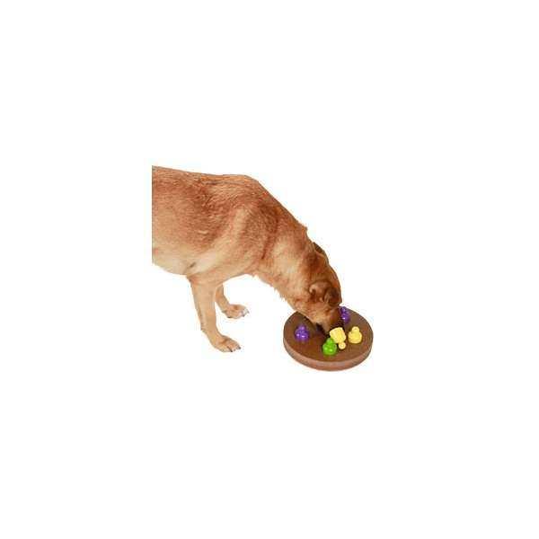 Dit spel van Kerbl biedt twee verschillende denkopdrachten in één doos: een hoedjesspel en een draaiplateau. Bij beide varianten worden stukjes lekkers in openingen gelegd en worden die vervolgens afgedekt, zodat de hond moet ontdekken hoe hij erbij komt. Het spel is compact en bedoeld om op een rustige manier bezig te zijn met je hond.