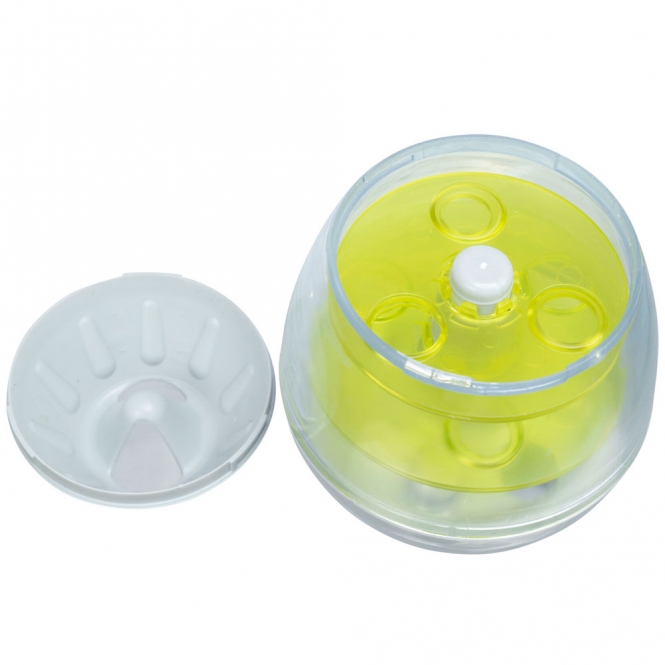 Dit is een interactief snack-ei van Trixie dat bedoeld is als denkspel voor honden. Het speelgoed heeft meerdere onderdelen die je kunt verstellen om de traktatie-uitgifte te beïnvloeden.