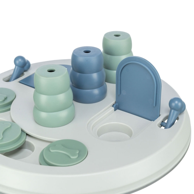 Op het bord zitten verschillende uitsparingen die je kunt vullen met kleine snacks of beloningen. Sommige deksels moeten naar de zijkant geschoven worden, andere moeten omgeklapt worden zodat de hond erbij kan. Daarnaast horen er drie kegels bij die omgestoten kunnen worden om bij de traktatie te komen.