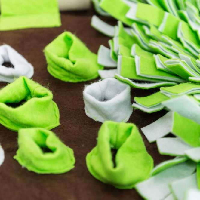 De mat combineert een snuffelgedeelte met vele verstopplaatsen, die in meerdere variaties uitgevoerd zijn. Je kunt kleine beloningen op verschillende manieren verstoppen, zodat elk speelmoment anders is. Dat maakt het mogelijk om makkelijk te variëren zonder extra materialen.