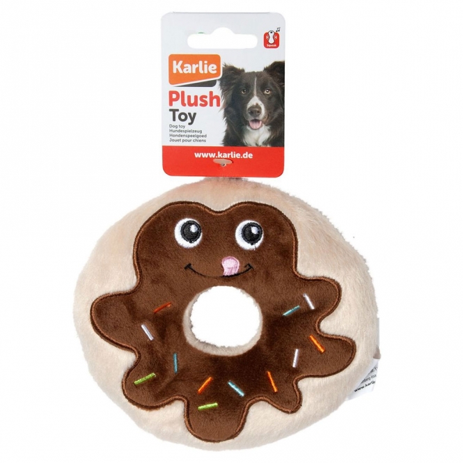 Dit is een zacht pluchen honden-speelgoed in de vorm van een donut, afkomstig van Karlie. Het speeltje heeft een ingebouwde pieper die geluid maakt tijdens het spelen. Het formaat is handzaam en bedoeld voor speels gebruik binnenshuis of buitenshuis onder toezicht.