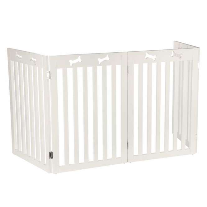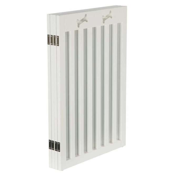 Dit opvouwbare hondenhekje is gemaakt van gelakt MDF en heeft een rustige witte kleur. Het is bedoeld om ruimtes en trappen af te scheiden en kan ook bij grotere honden gebruikt worden. Dankzij het vouwbare ontwerp kun je de breedte aanpassen en het hekje gemakkelijk opbergen wanneer je het niet nodig hebt.