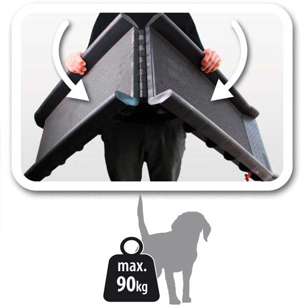 De ramp is stevig van constructie en ontworpen om ook zwaardere honden te dragen zonder te buigen tijdens gebruik. Zorg dat de ramp goed aansluit op de auto zodat er geen kieren of scherpe randen ontstaan. Controleer voor gebruik altijd even of alles goed vastligt.