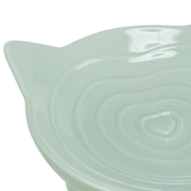 Dit is een keramische voer- en drinkkom in salbei. De vorm is iets verhoogd en is ergonomisch bedoeld zodat de kat gemakkelijk bij de inhoud kan. Tegelijk is de kom plat uitgevoerd, waardoor hij laag blijft in de opstelling.