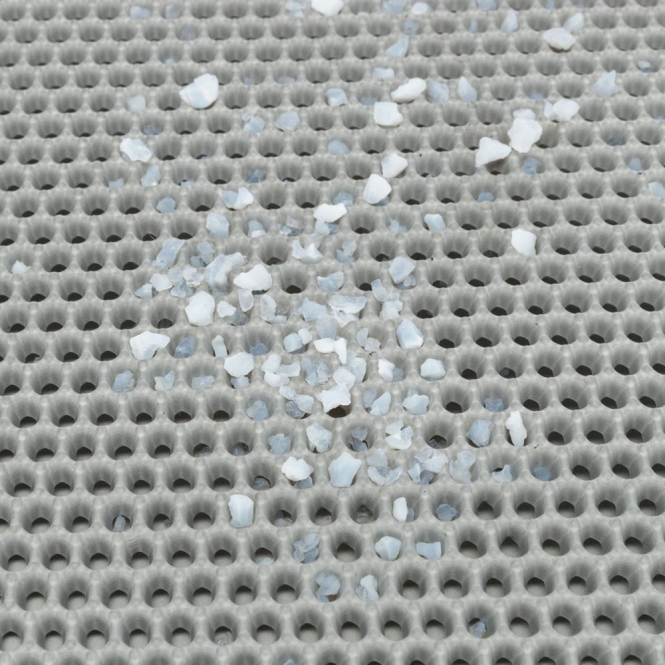 De bovenlaag vangt de korrels op die aan de poten van de kat blijven kleven, zodat ze niet verder het huis in lopen. De structuur voelt stevig aan en geeft een stabiel ondergrondje bij het verlaten van de bak. Omdat de mat niet hoog is, kan de kat er eenvoudig overheen stappen zonder dat het hinderlijk aanvoelt.