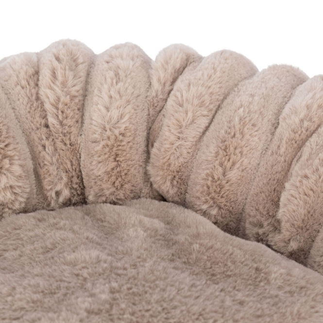 De buitenstof is zachte pluche met een brede ribcord-look waardoor het een warme uitstraling heeft. De stof is van polyester en voelt aangenaam zacht aan als een dier erin gaat liggen. Het binnenkussen is vast geïntegreerd en opgevuld met polyestervlies, wat zorgt voor een gelijkmatige ondersteuning over de ligplek. De onderkant is voorzien van een ruwere laag die maakt dat het bed minder makkelijk wegglijdt op gladde vloeren.