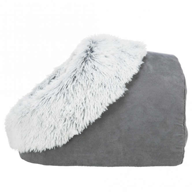 De buitenkant is gemaakt van velours en langharig pluche, wat zorgt voor een zachte uitstraling en gevoel. De buitenlaag bestaat uit polyester, een materiaal dat veel wordt gebruikt bij huisdierproducten. De binnenkant is opgevuld met schuim, zodat de vorm steun geeft zonder te hard te zijn. De combinatie van materialen zorgt dat het geheel soepel aanvoelt en toch vormvast blijft.