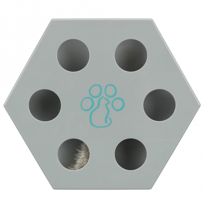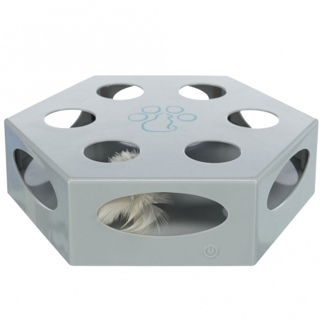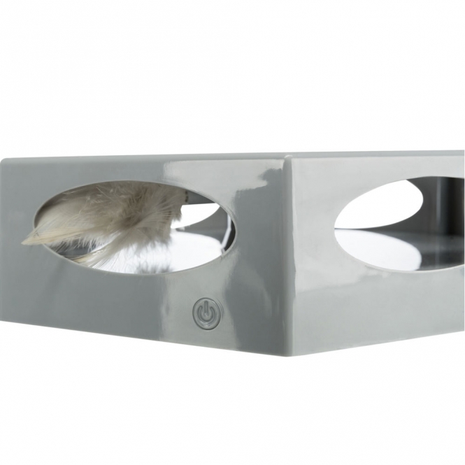 Dit is een rustig beschreven kattenspeeltje van Trixie met een draaiende veer in het midden. De veer beweegt onregelmatig en stopt af en toe, waardoor het spel onverwachte bewegingen krijgt. Het speeltje is gemaakt van kunststof en heeft een sobere grijze kleur; het valt niet opvallend op in huis.