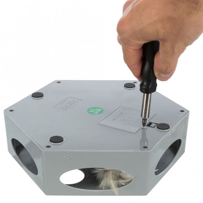 De rubberen voetjes verminderen schuiven en helpen het speeltje op zijn plaats te houden tijdens beweging. Het toestel is gemaakt van stevig kunststof dat tegen een stootje kan bij normaal gebruik. Controleer het speeltje af en toe op losse delen en slijtage voordat je het aan je kat geeft.