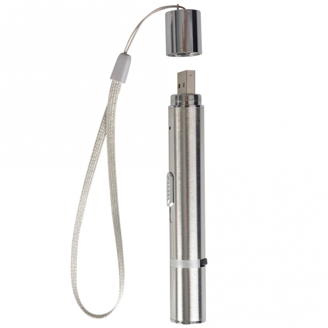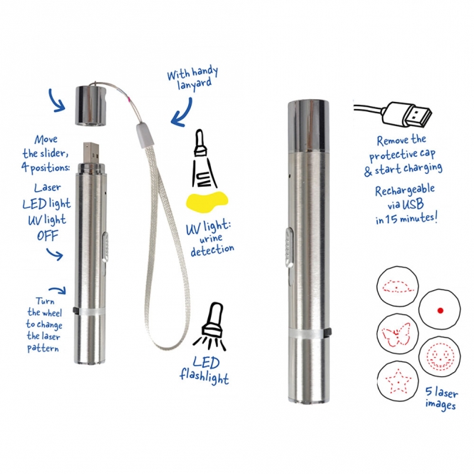 De duvoplus LED-laserpointer is een compact speeltje voor katten dat uitnodigt tot achtervolgen en spelen. Het apparaatje geeft een rood lichtpuntje waarmee uw kat kan jagen en biedt meerdere verschillende laserbeelden om het spel afwisselend te houden. Daarnaast heeft de pointer een LED-licht en een UV-licht, en wordt hij geleverd met een draagriem voor eenvoudig meenemen. Het apparaat is oplaadbaar via USB en is gemaakt van een combinatie van metaal en kunststof.