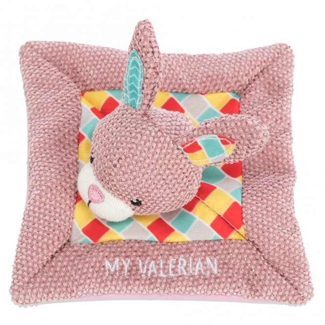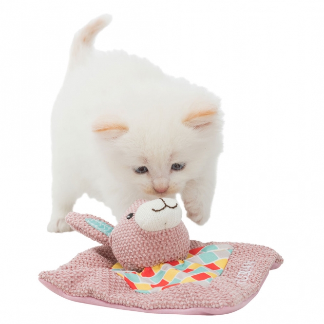 Een klein knuffeldoekje met een konijnenmotief, bedoeld als speeltje voor katten. Het doekje is gemaakt van polyester en bevat valeriaan, een bekende plantengeur die katten vaak interessant vinden. Het formaat is compact en bedoeld om makkelijk vast te pakken en mee te sjouwen. Het voelt aan als een zacht lapje waar katten aan kunnen snuffelen en tegenaan kunnen wrijven.