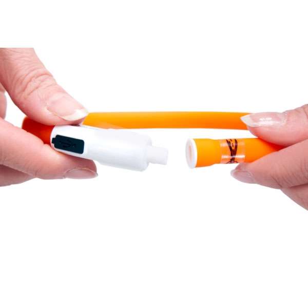 Het slangetje bevat ledjes die licht geven wanneer het apparaat aan staat. U zet het licht aan in een knipperstand of in een constante stand, afhankelijk van wat u prettig vindt. De energie wordt geleverd door een interne accu die u met het bijgeleverde kabeltje kunt opladen. Omdat er geen wegwerpbatterijen nodig zijn, hoeft u die niet steeds te vervangen.