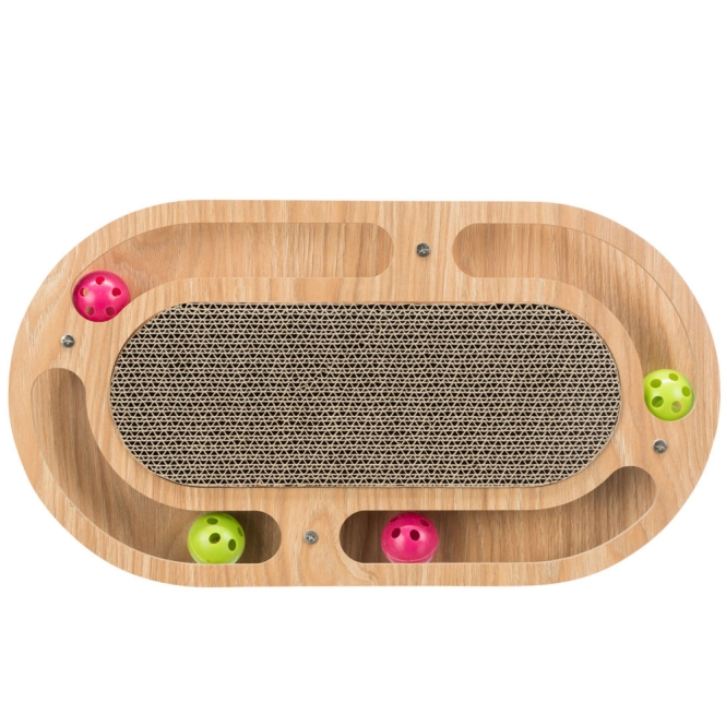 Katten gebruiken dit soort krabplank vaak om hun nagels te scherpen en om te rekken. Het kraboppervlak voelt anders aan dan stoffen of sisal, waardoor katten er op een eigen manier op reageren. De balletjes kunnen uitnodigen tot duwen en vangen, wat het gebruik afwisselend maakt.