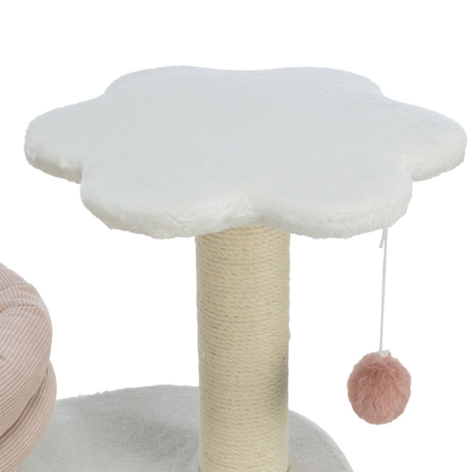 De bekleding bestaat uit pluche en cord-achtig polyester waardoor de ligvlakken zacht aanvoelen. De krabpaal zelf is omwikkeld met jute, een materiaal dat veel katten fijn vinden om aan te krabben. Deze combinatie van materialen levert een rustige, natuurlijke uitstraling op die in veel interieurs past.