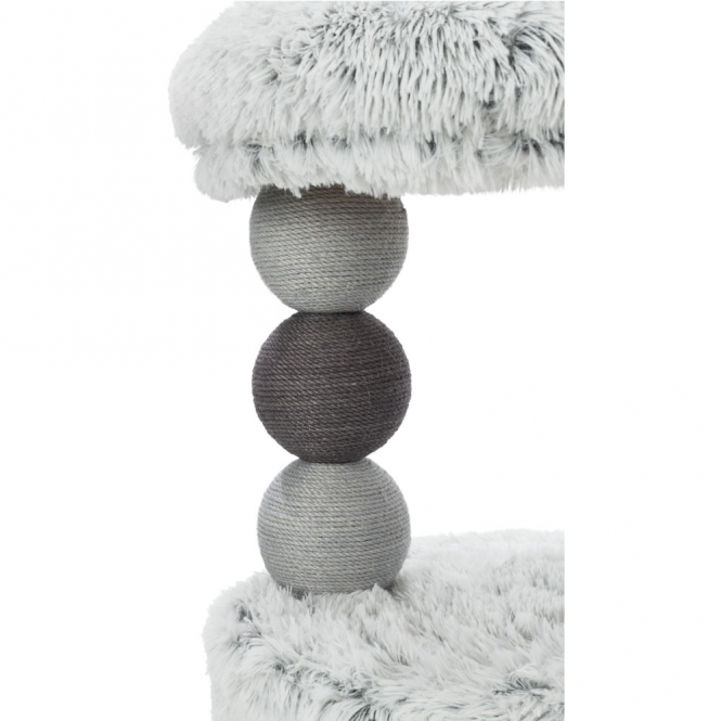 De paal is omwikkeld met jute, dat een grove structuur heeft waar katten met hun nagels in kunnen werken. De ligvlakken zijn bekleed met langharig pluche dat zacht aanvoelt en een warme indruk geeft. Binnenin de holte is fleece gebruikt, wat prettig aanvoelt wanneer een kat naar binnen kruipt.