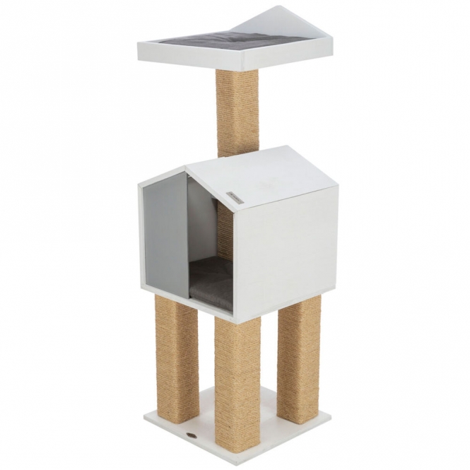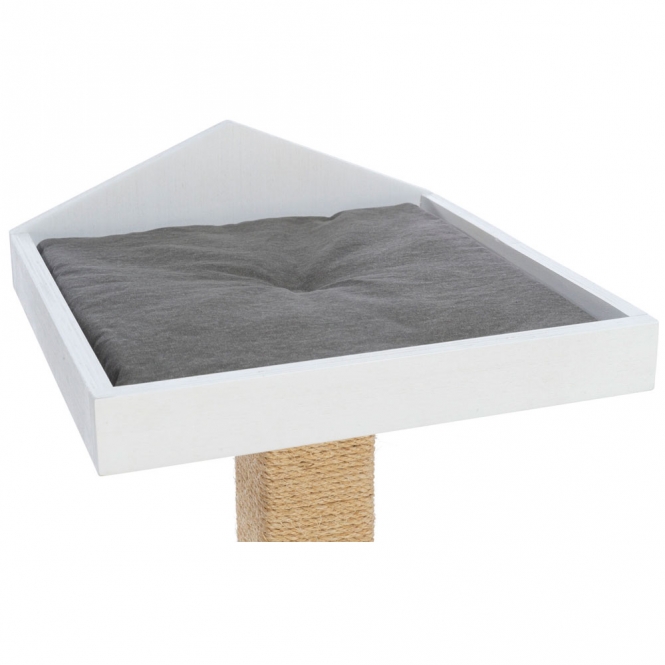Deze krabpaal is bedoeld voor huiskatten en biedt meerdere plekken om te rusten, te spelen en te krabben. Hij is gemaakt met sisaltouw en gelakte houten onderdelen en heeft een zacht ligbed en een holletje met omkeerbare kussentjes van canvas. De kleuren zijn rustig gehouden in grijs en wit, zodat hij makkelijk in verschillende kamers past. Het ontwerp is compact van voet en heeft een hogere structuur waar katten op kunnen klimmen en zitten.