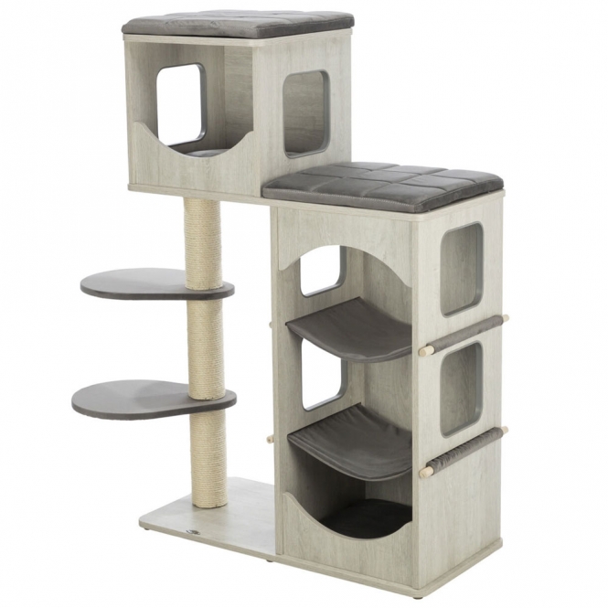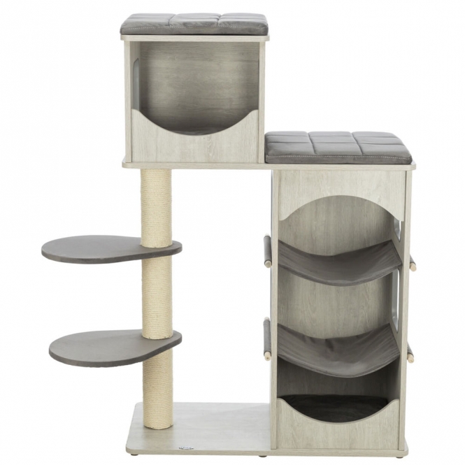 De Trixie Kratzbaum Adriano is een katmeubel met verschillende plekken om te rusten en te spelen. Het meubel is uitgevoerd in een rustige grijstint en heeft onderdelen met sisal en een houtlook afwerking. Op dit krabmeubel zitten lichte ligplaatsen, verborgen holletjes en hangmatten waar een kat zich terug kan trekken of mee kan spelen. De materialen en de vormen zijn gekozen met het oog op dagelijks gebruik in huis.
