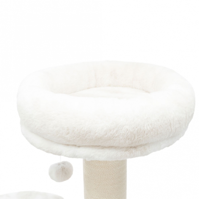 Deze krabpaal is een rustig vormgegeven meubel voor katten, bedoeld om klim- en rustgedrag te ondersteunen zonder te veel poespas. Hij is bekleed met jute en pluche materialen zodat er zowel een ruwe als een zachte ondergrond is. Er is een hol met zachte bekleding en een ligplateau met een afneembaar knuffelbed, zo ontstaan meerdere plekken om zich terug te trekken of uit te rusten. De kleuren zijn neutraal gehouden in wit en taupe, waardoor de paal goed in verschillende ruimtes past.