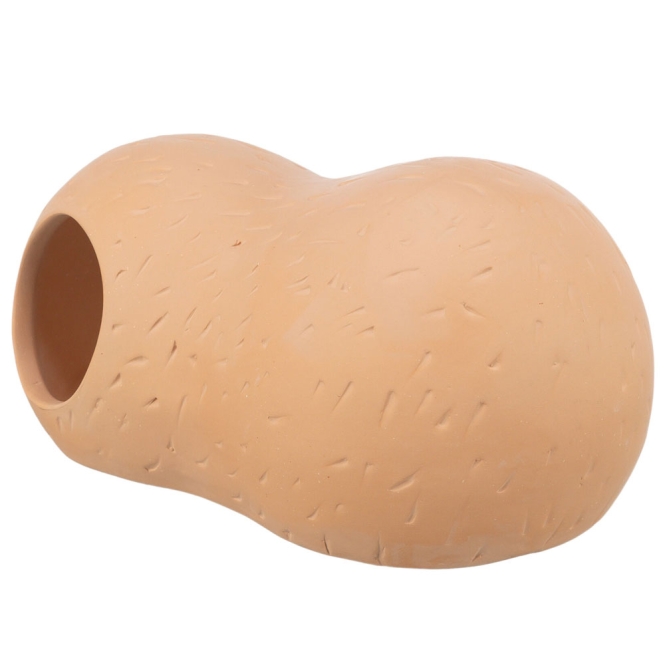 Het huisje is gemaakt van keramiek en heeft een natuurlijke, matte uitstraling in terrakotta. Keramiek voelt stevig aan en is vormvast, waardoor het een stabiele schuilplaats vormt. Het materiaal past goed bij een natuurlijke inrichting van het verblijf.