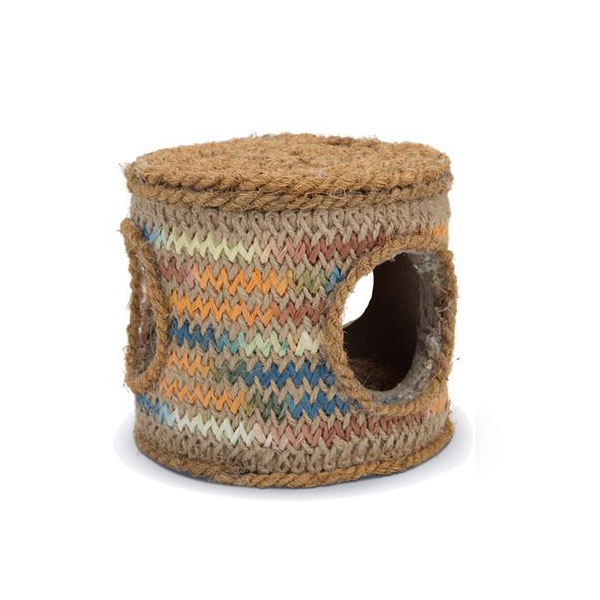 Het kokoskoord geeft een rustieke, natuurlijke structuur die anders aanvoelt dan gladde materialen. Dat maakt het voor dieren interessant om met hun snuit, poten of tanden te onderzoeken. Het materiaal is duidelijk genoemd in de omschrijving en vormt het belangrijkste kenmerk van het voorwerp. Vanwege die materiaalkeuze past het goed in verblijven met een natuurlijke uitstraling.