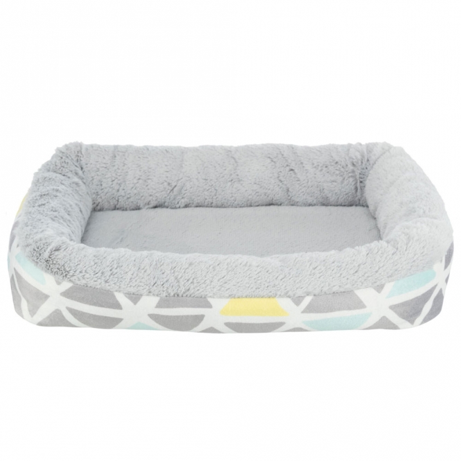 Dit knuffelbedje van Trixie is bedoeld voor kleine huisdieren en geeft een zachte, beschutte plek om te liggen. De buitenkant is gemaakt van kortharig pluche met een polyester hoes, en de rand is opgevuld met polyestervlies. Het ligvlak heeft een schuimvulling voor steun, en aan de onderkant zit een antisliplaag zodat het bedje op zijn plek blijft. De kleuren zijn gemengd met grijsachtige tonen en vrolijke accenten, en het bedje heeft een compact formaat dat in veel verblijven past.