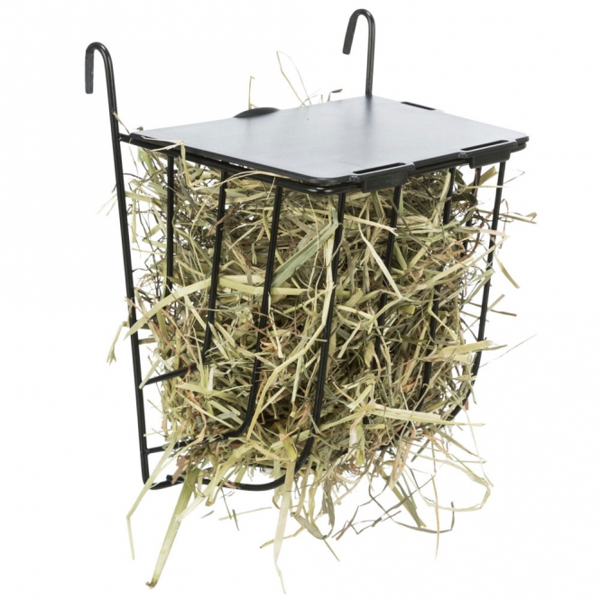 • Hangend te bevestigen, zodat hooi van de vloer en het hok af blijft en minder rommel ontstaat.