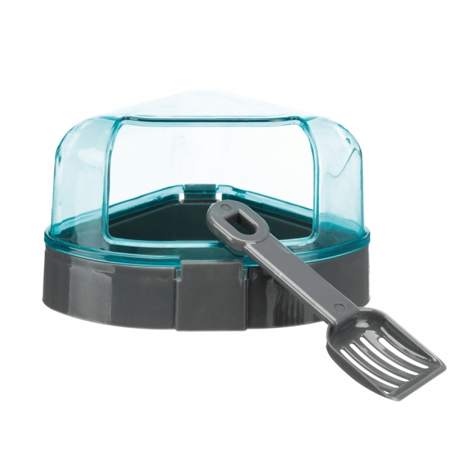 Dit is een hoektoilet met dak voor kleine knaagdieren, gemaakt van kunststof. Het is bedoeld om de leefruimte van het dier overzichtelijker te houden en om het schoonmaken eenvoudiger te maken. Bij het product hoort een schepje waarmee je het materiaal gemakkelijk kunt verwijderen.