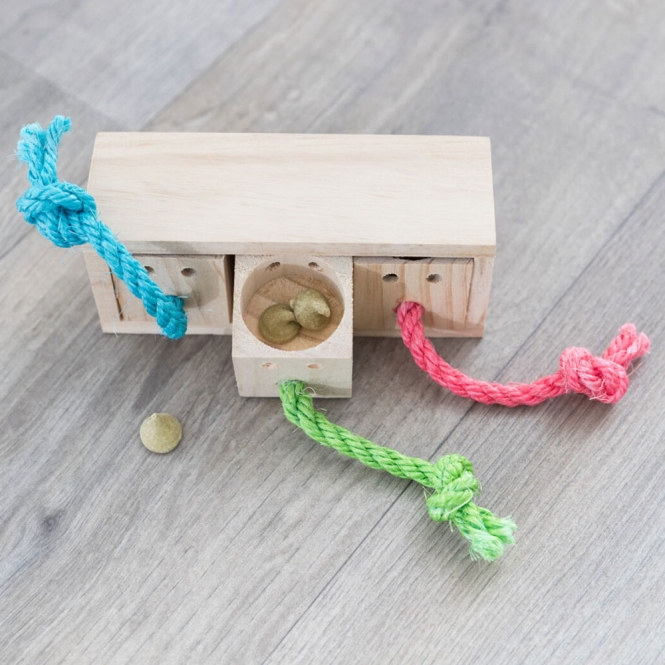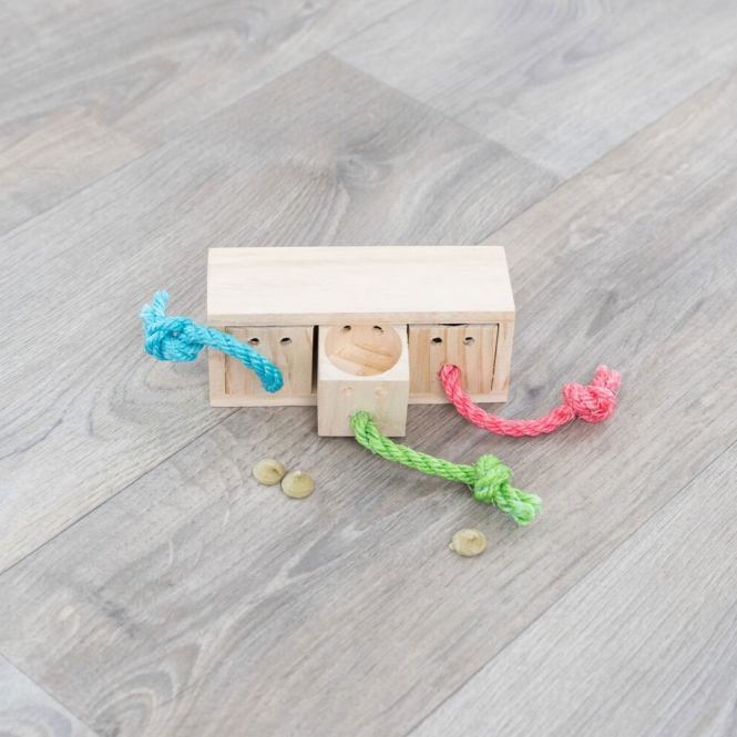 Een houten snackkubus voor vogels en kleine huisdieren die je vult met lekkernijen en waarbij het dier via schuifjes en touwtjes bij de beloning komt. Het is bedoeld als eenvoudige puzzel om zoeken en trekken uit te lokken, zonder ingewikkelde onderdelen. Het materiaal is onbehandeld hout en er zit een korte trainingsinstructie bij. Het apparaat is geschikt voor zowel vogelsoorten als kleine knaagdieren en is gemaakt met diervriendelijkheid in gedachten.