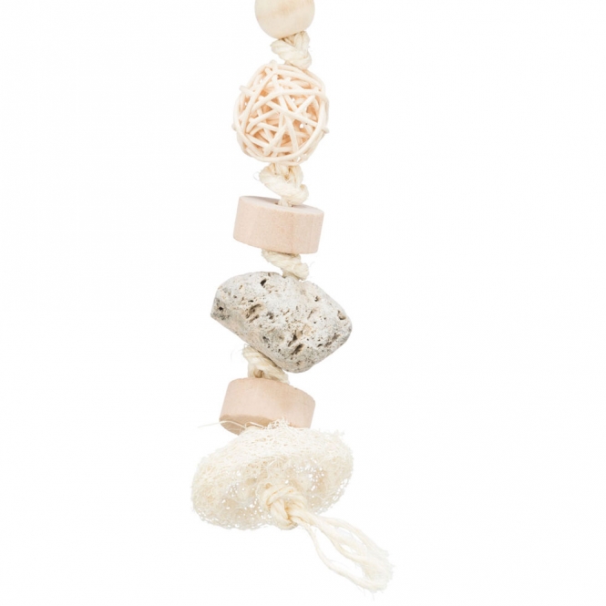 Omdat het geheel van natuurlijke onderdelen is gemaakt, ziet het er rustig en onopgesmukt uit in de kooi. De combinatie van materialen biedt verschillende grijpmogelijkheden en texturen voor de snavel en poten. Dat maakt het speelgoed herkenbaar en aantrekkelijk zonder fel plastic of felle kleuren.