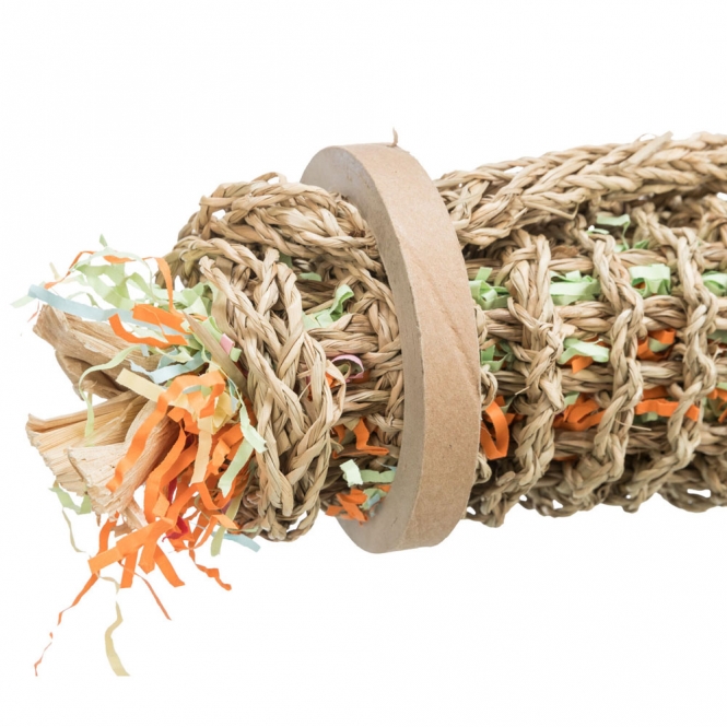 Het speeltje is samengesteld uit seegras, hout en papier en heeft daardoor een natuurlijke uitstraling die in veel kooien rustig oogt. De materialen voelen anders aan en bieden verschillende texturen om te verkennen met de snavel. Omdat alle onderdelen natuurlijk zijn, past het goed bij een omgeving waarin je hout en andere natuurmaterialen gebruikt. Het geheel heeft een simpele, natuurlijke vorm zonder felle kleuren of harde kunststoffen.