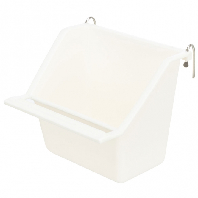 Het bakje is bedoeld om aan de randen van de kooi te worden gehangen, zodat het tijdens gebruik niet gemakkelijk verschuift. De hanger zorgt ervoor dat het bakje op enige hoogte blijft en niet op de bodem staat, wat rommel vermindert. Controleer na ophangen altijd of het bakje stevig vastzit en niet kan losschieten bij beweging.