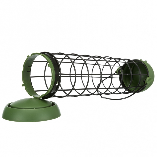Dit is een eenvoudige houder voor vetbollen, gemaakt van kunststof en metaal en uitgevoerd in groen. De houder heeft een opklapbare deksel en een afneembare bodem, zodat vullen en legen overzichtelijk gaat. Door de mogelijkheid om op te hangen kun je hem ergens buiten ophangen waar vogels veilig kunnen eten.