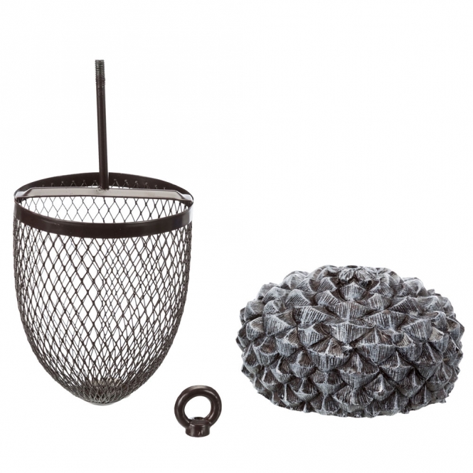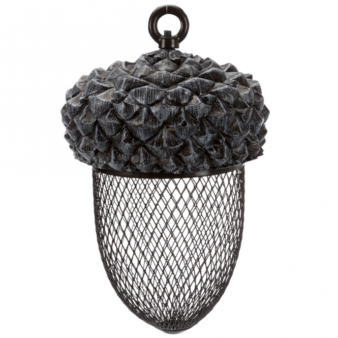 Het is een voederhouder in de vorm van een eikel, bedoeld om voedingsstukken van bovenaf in te doen. De constructie combineert een kunststof hars met metalen onderdelen, wat zorgt voor stevigheid en een natuurlijke uitstraling. De kleuren bruin en wit maken dat het goed opgaat in veel tuinomgevingen.